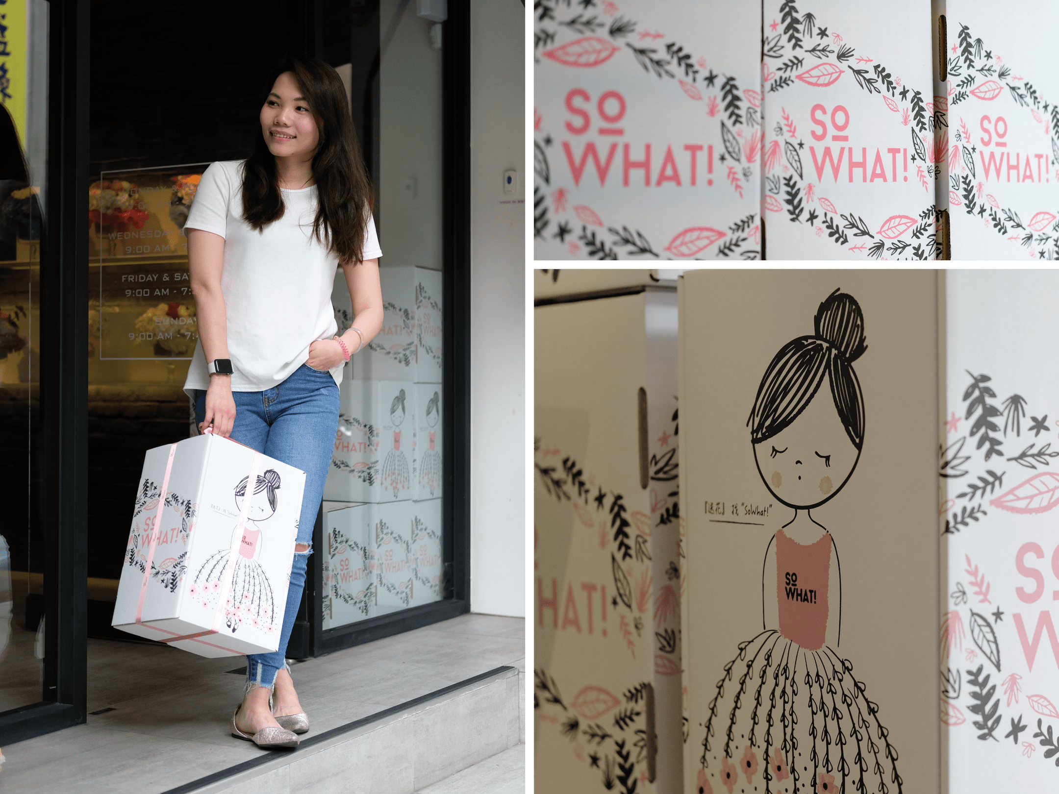 這間店的每一寸都綴著粉紅:高腳玻璃瓶裡一簇簇粉紅色玫瑰、繡球、桔梗,像旋轉的芭蕾舞者;櫃上繫著粉色緞帶的紙箱、門口的粉紅色腳踏車……目光停在牆上的粉色店名「SoWHAT」,諧音「送花」,故名思義是網路訂花、送花的小店。